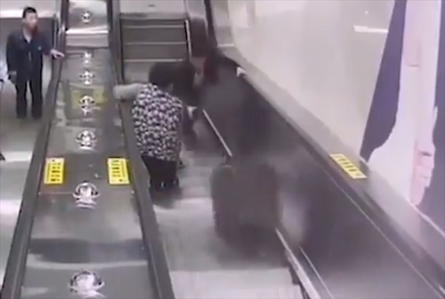 危ないっ!エスカレーターの上から女性をめがけて転がり落ちてきたスーツケース。一歩間違えれば大惨事という危機を救ったのは、近くにいた勇気ある男性でした!