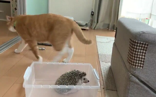 さにたすさんてちくわ丸の人(@tikuwamaru0728)さんのお家で暮らしている、猫の「さんて君」とハリネズミの「さにたすちゃん」のやり取りを映した動画がカワイイ!と話題になっています。