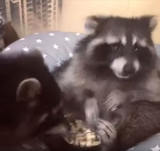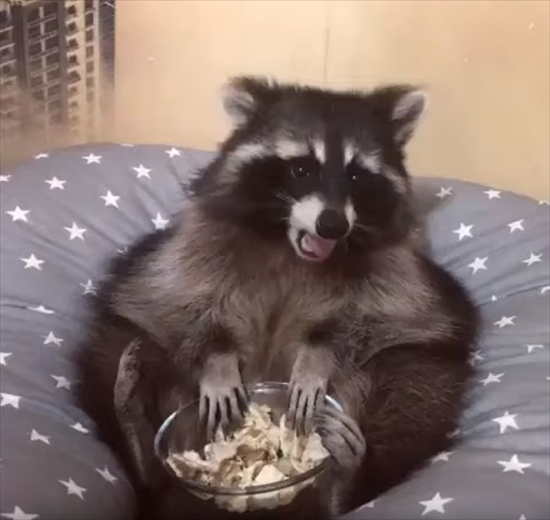 まるで人間のように、あぐらをかいてムシャムシャとおやつを食べるアライグマ。その可愛らしい様子を撮影した動画をご紹介します!