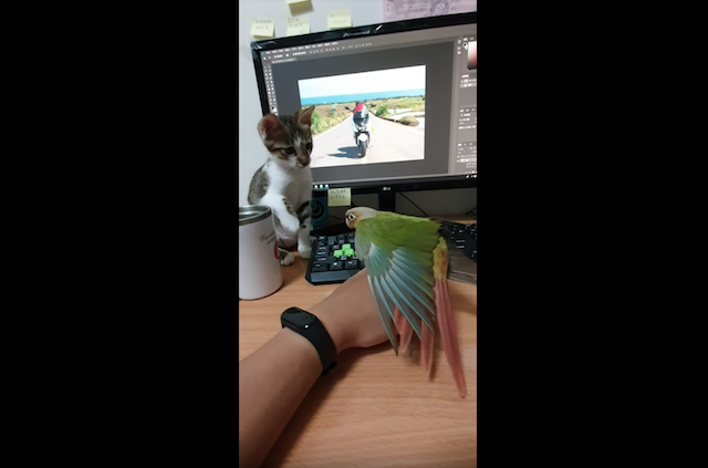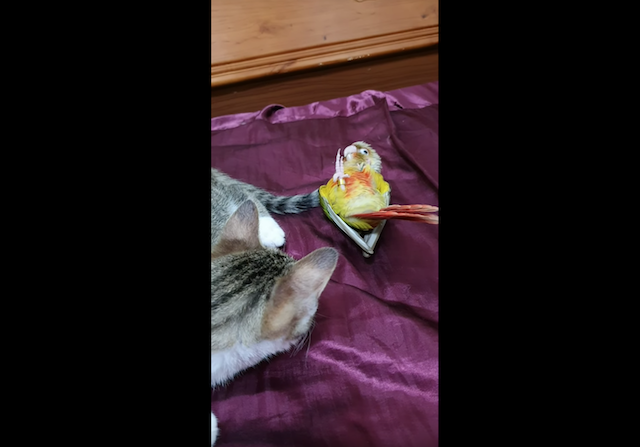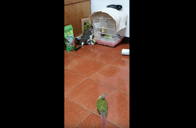 台湾のとある家庭で撮影された、こちらのニャンコと小鳥さん。