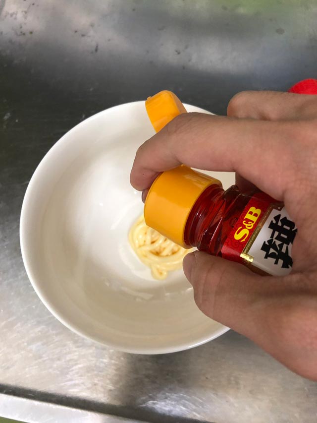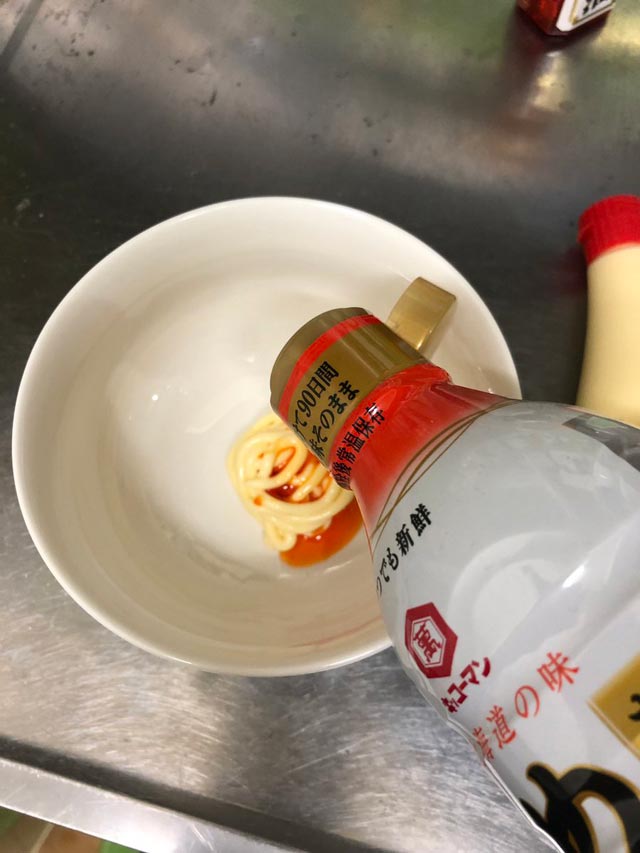 ラー油とマヨネーズを馴染ませてから、麺つゆを加えます。写真では、北海道だけで売っている「めんみ」という麺つゆを使用中とのことです。