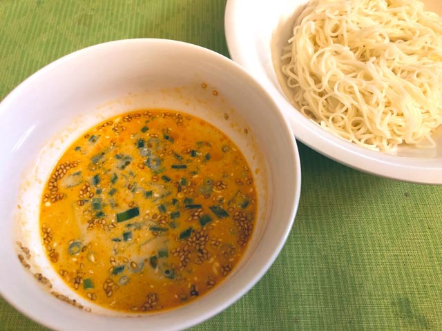 マヨネーズ大さじ1くらいに麺つゆとラー油を垂らしてネリネリしたら、麺つゆと水を足して量と味の濃さを整えて、炒りごまと青ネギをまぶす。