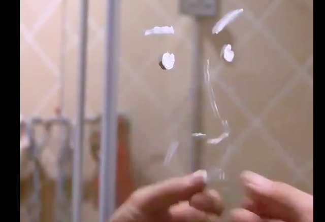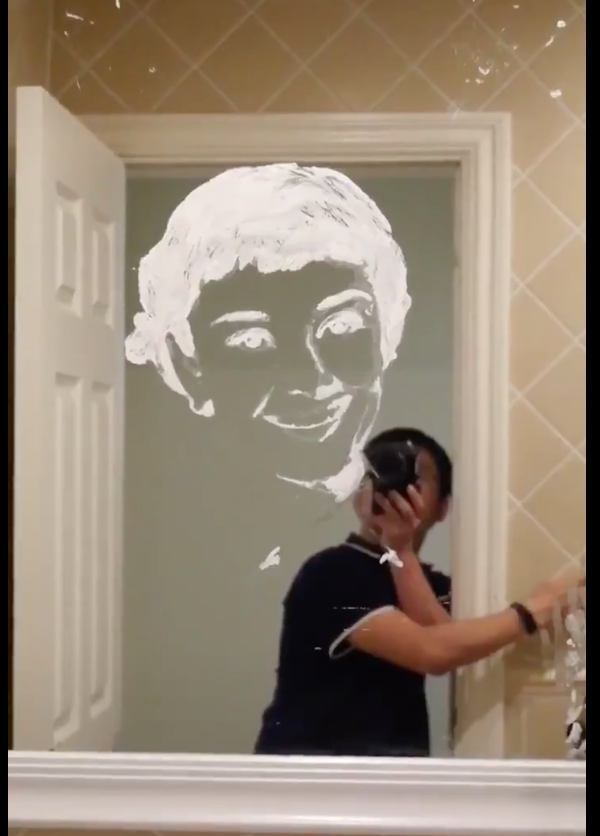 歯磨き粉で鏡に絵を描いているこちらの男性。