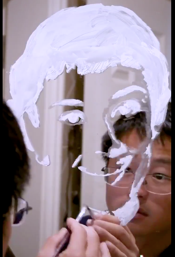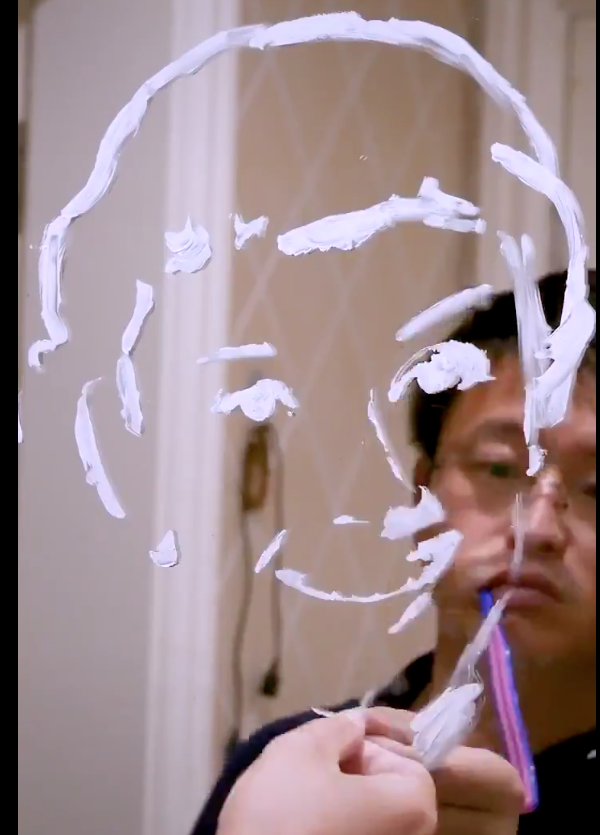 男性は歯を磨きながら、どうやら人の顔らしきものを描いています。