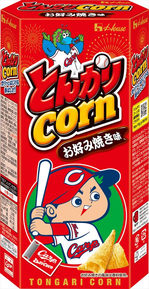 ハウス「とんがりコーン(税別220円)」<お好み焼き味>は、7月8日(月)から中国・四国エリアで数量限定での発売です。カープファンの皆様、そしてとんがりコーンが大好きな方もぜひ買ってみてはいかがでしょうか。