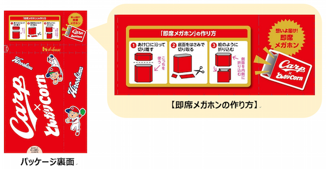 なんと今回はただとんがりコーンの味を楽しむだけじゃありません!とんがりコーンお好み焼き味の空箱で「即席メガホン」を作れるようにデザインされています!