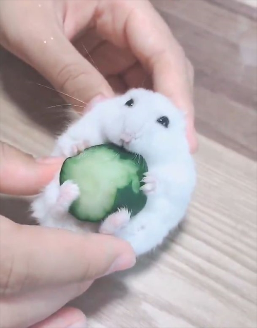 抱きかかえるようにキュウリにかじりつくハムスター♪ とっても可愛いですよね。そんなハムスターをおさえている手を放した時の動きがTwitterで反響を呼んでいたのでご紹介します!