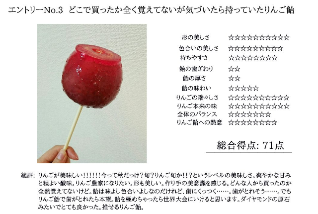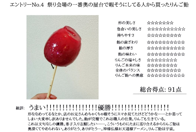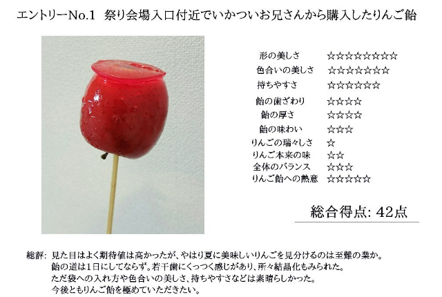 それにしても採点項目の多さ!あらゆる角度からりんご飴と向き合っていますね!