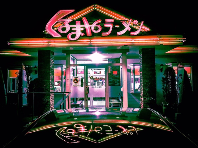 投稿されたのは、Twitterユーザーの純米大吟醸アメコミ(@DJamecomi)さん。「超カッコよく撮れたので見て欲しい」とコメントを添え、サイバーパンクな世界観の『くるまやラーメン』を投稿しています。