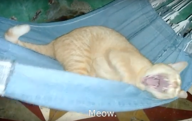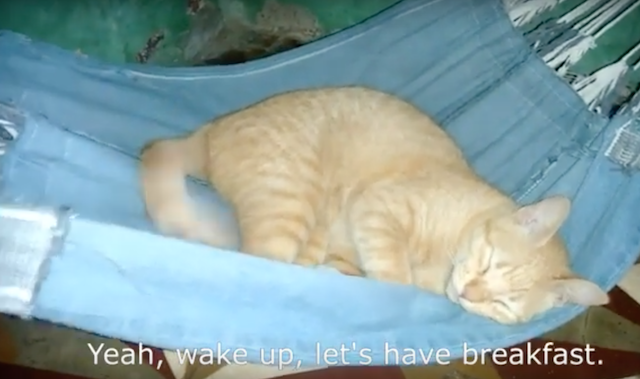 ハンモックの上で気持ち良さそうに寝ていますが、もう朝です。そろそろ起きないといけないので、飼い主さんが起こそうとしても駄々をこねて起きようとしません。