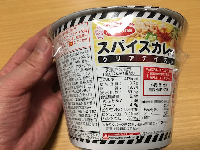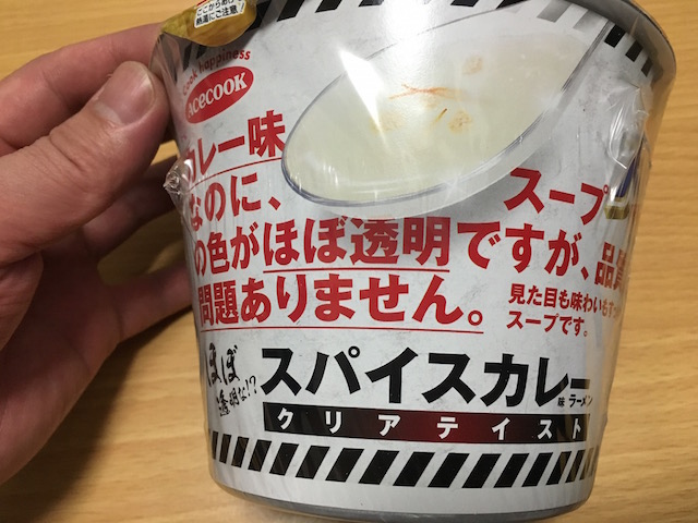 そして側面には赤くデカデカと、「カレー味なのに、スープの色がほぼ透明ですが、品質には問題ありません」という文字が書かれていますね。
