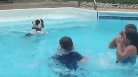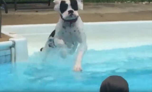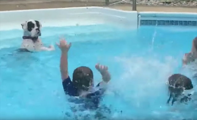 楽しそうにプールではしゃいでいる子供達を見ていたボクサー犬。「僕も遊びたいワン!」と言わんばかりに、プールに飛び込みます!