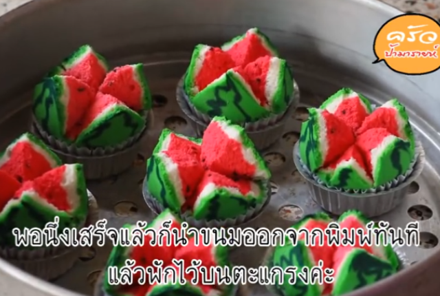 実はこのケーキ、タイのスイーツで、「焼く」のではなく「蒸す」カップケーキなんだとか。自然とぱっくり割れた見た目がカットスイカをお皿に並べているようで華やかですよね!