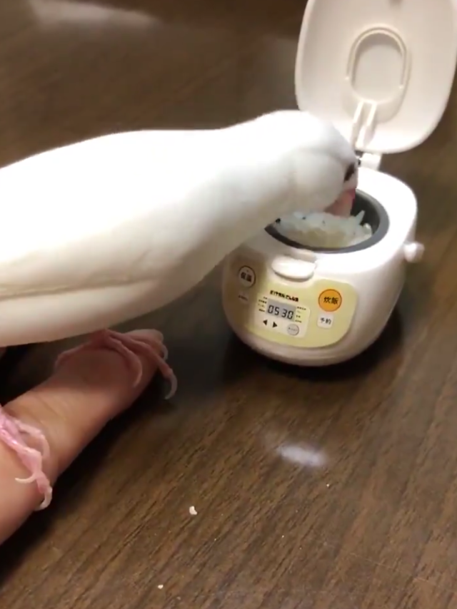 話題の動画を投稿したのは、真っ白な文鳥・みるくちゃんの飼い主であるともぞう(@azukimilksan)さん。「欲しくて欲しくて堪らなかった炊飯器をゲット!米を食べる姿が可愛すぎる。」というコメントとともに、ともぞうさんが投稿したこちらの動画をご覧ください。