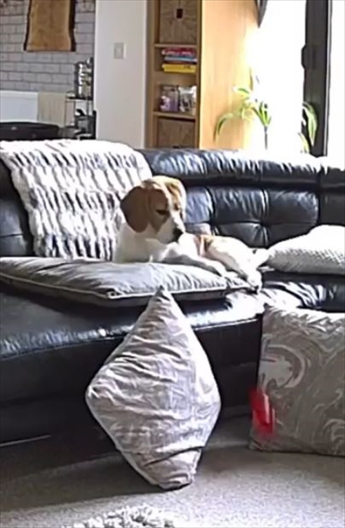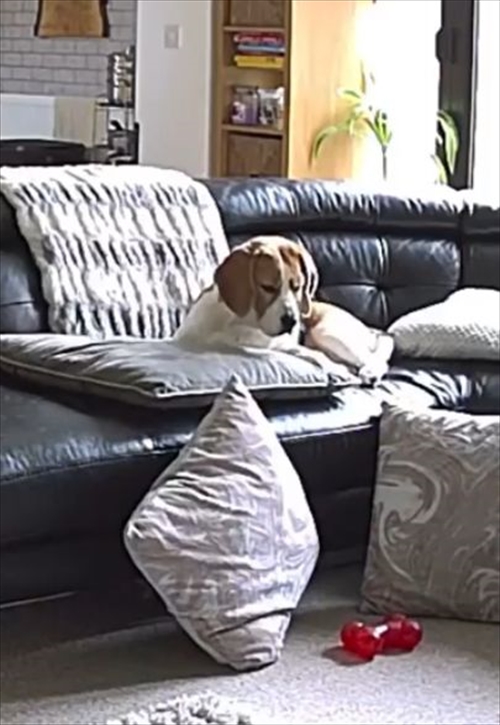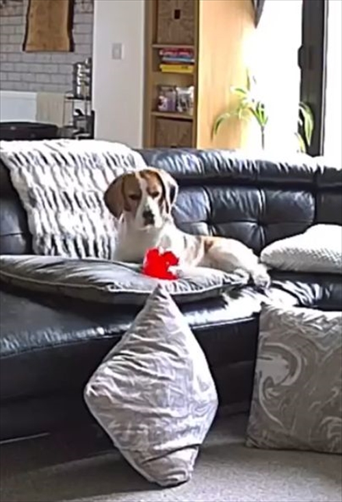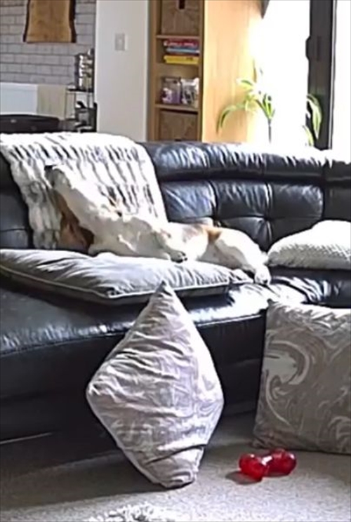 ソファの上でくつろぎながら、前足で赤いオモチャを転がすワンコ。いつも大切にしているオモチャのようですが、次の瞬間…