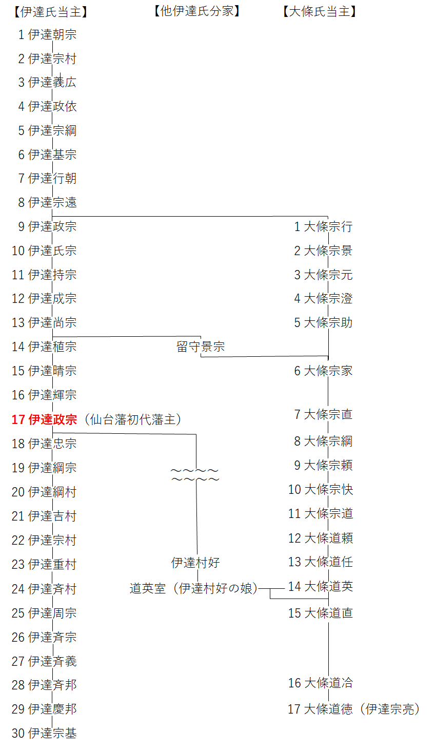 伊達氏当主と大條氏当主の関係性を合わせた家系図を作成しましたので、こちらもご覧ください。名前の横の数字が代数になっています。また、伊達氏当主と大條氏当主の活躍時期を合わせるために当主名の間隔がずれています。