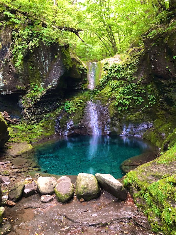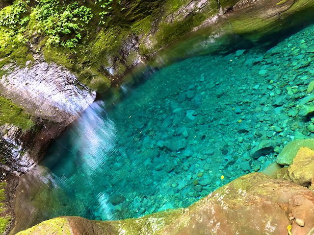 上から下へ勢いよく落ちる水もステキですが、下に溜まっている水が青く光り輝いているのがまた美しい!