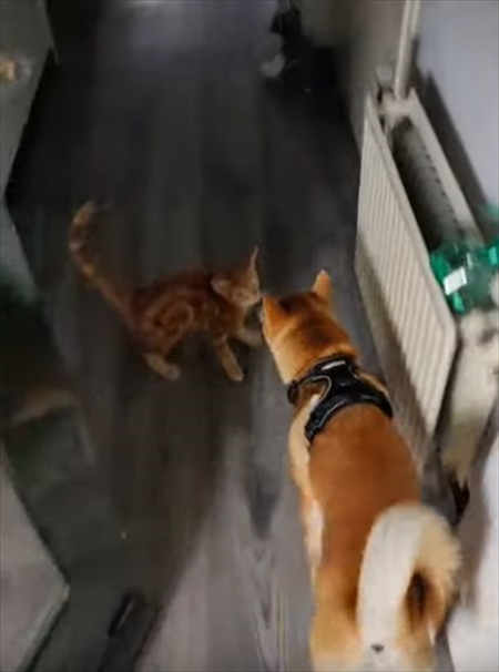 場所はオランダのとあるご家庭。柴犬のシェルビーが散歩から帰ると、待ち構えていたのは生後10週の子猫シンバ。