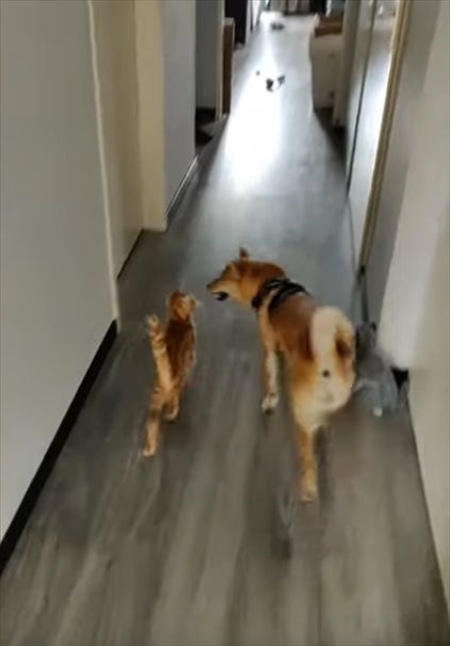 シェルビーが奥の部屋に走って行くと、シンバはその横にぴったりとくっつきながら並走します。この雰囲気だと、シェルビーはくつろぐ暇もなさそうですね。