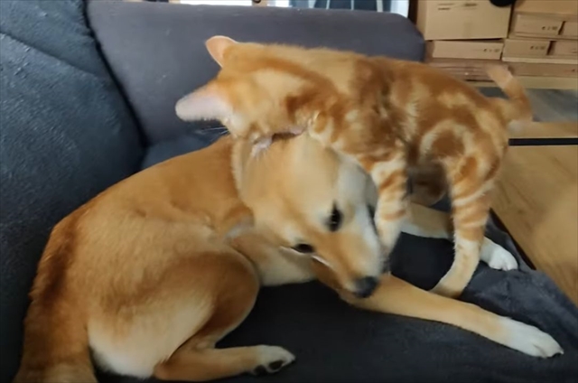 日頃からとっても仲が良いというシンバとシェルビー。シェルビーが散歩で家にいない間は、遊びたくて遊びたくて仕方がなかったことが分かりますね!