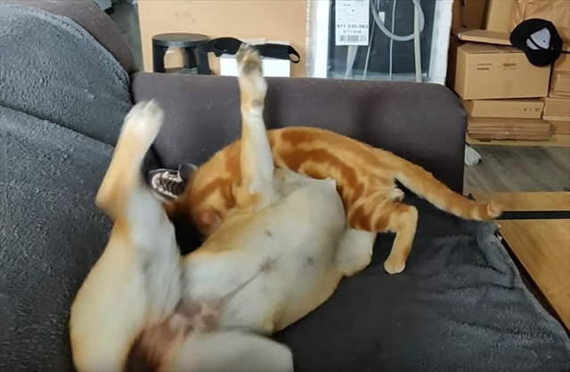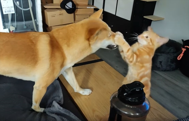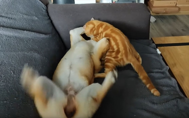 ワンコが散歩からお家に帰宅するやいなや、待ってましたニャン!とばかりにワンコと凄まじい勢いでじゃれあうニャンコ。その光景は、まるで総合格闘技!?を彷彿させるかのような激しいものでした…。