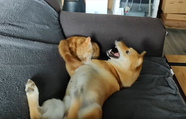 そしてソファの上に行くと… 早速戦いが始まった…!?