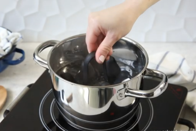 卵をはめ終えたら、持ち手を握って沸騰したお湯の中に入れるだけ。