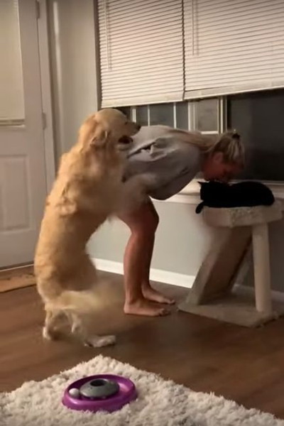 大きな体とブロンドに輝く毛色を持つ立派なゴールデンレトリバーですが、その堂々たる外観とは裏腹にとってもやきもちやき。猫に注目する飼い主さんを自分に振り向かせそうとする行動が、必死過ぎていて面白いんです♪