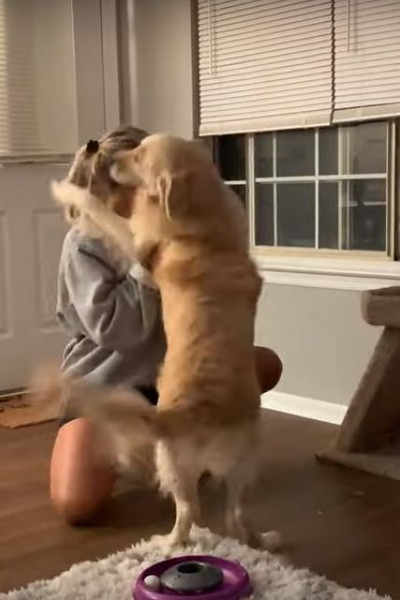 やっと飼い主さんを独り占めできたデイジーちゃん。飼い主さんに抱き着き、ちぎれそうなほど尻尾を振っています!