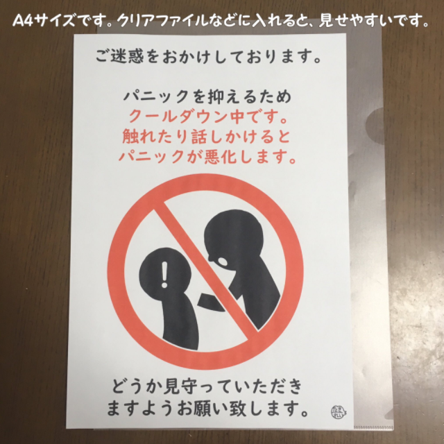 子供のパニックを最短で鎮えるため、親御さんがあえて触れたり話しかけることをせずクールダウンを実践している可能性もあるということです。そんな状況で、周りの痛々しい視線を集め、胃に穴が空くような気持ちの親御さんをサポートするためにお知らせカードを作成されたのだそうです。