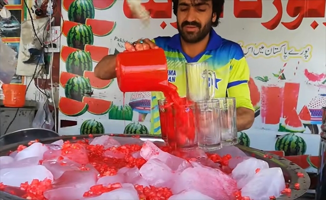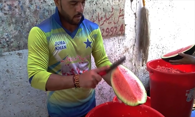 場所はパキスタン・カラチにあるフードストリート。スイカジュースで有名だという屋台で撮影されました。まずはスイカを半分にカットします。