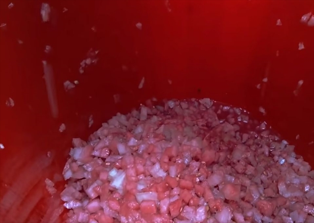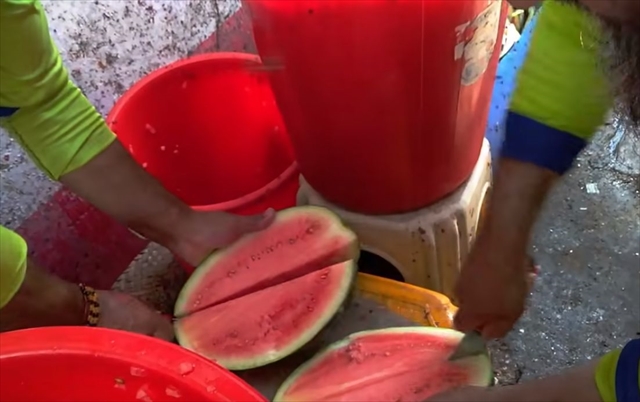みじん切りにしたスイカは、大きな容器の中へと流し込み・・