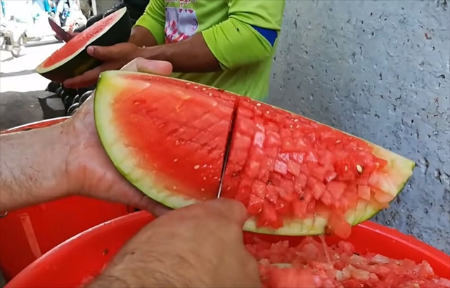 大量のスイカを次から次へとみじん切りにする屋台の店員。そのナイフさばきは、まさに職人芸!