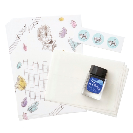 こちらが、宮沢賢治「銀河鉄道の夜」。レターセット、シールのデザインには、文豪にまつわるモチーフが随所に取り込まれています。