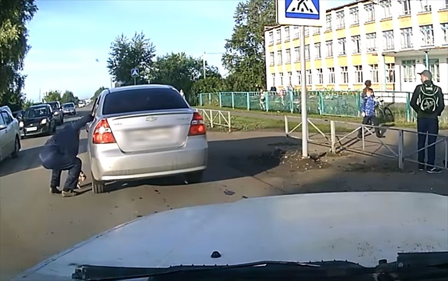 後方の車に乗っていた男性は、すかさず車を飛び出して子猫の救出に向かいます!