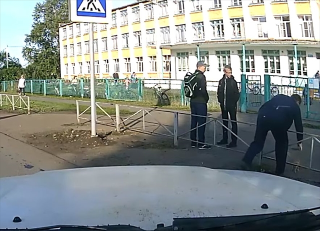 なんとか無事だった子猫。男性は、前の車のドライバーに子猫を見せた後、子猫を道路脇の安全な場所まで運びます。