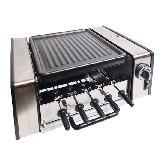サンコー株式会社から発売されたこちらのマシン。こちらをご覧の通り、上には焼肉用の鉄板プレート、その下には串焼きのスペースがあります。ヒーターを挟んで上下に分かれている構造ですね。