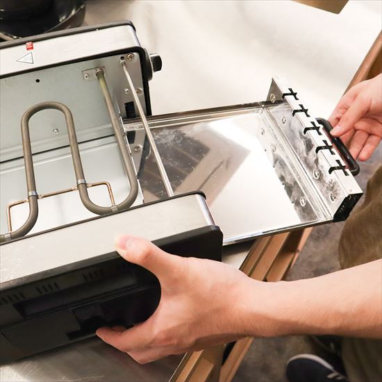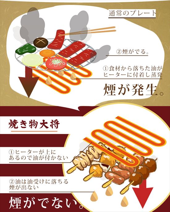 「焼き物大将」の場合は、油が本体の油受けに自動で溜まり、食材の油が直接ヒーターに付かない構造になっているので、焼肉プレートでも串焼でも煙がほとんど出ません。