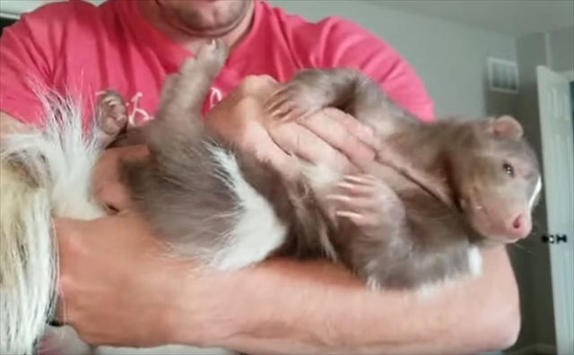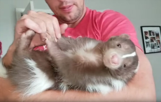 飼い主さんに抱っこされて、甘えた表情をみせるスカンク。その懐きっぷりが可愛らしいと話題になっている動画をご紹介します!