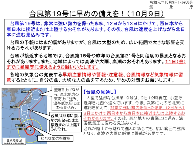 【台風に早めの備えを!】#台風19号 は、非常に強い勢力を保ったまま12~13日にかけて西日本から東日本に接近・上陸するおそれがあります。台風は大型のため、広い範囲で大きな影響を受けるおそれがあります。また、(続く) pic.twitter.com/aGCbcpmQoD