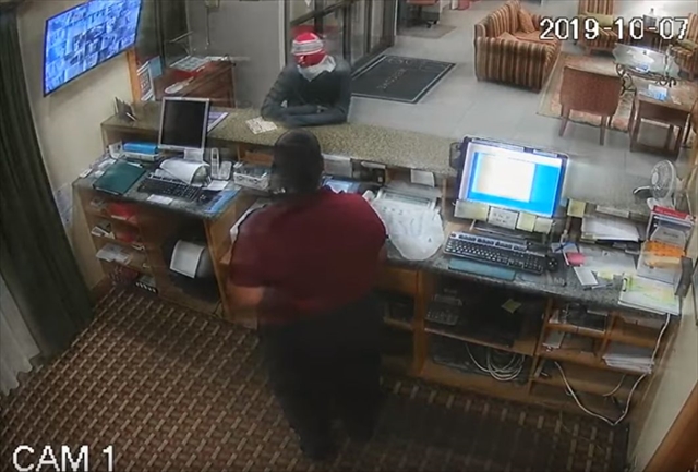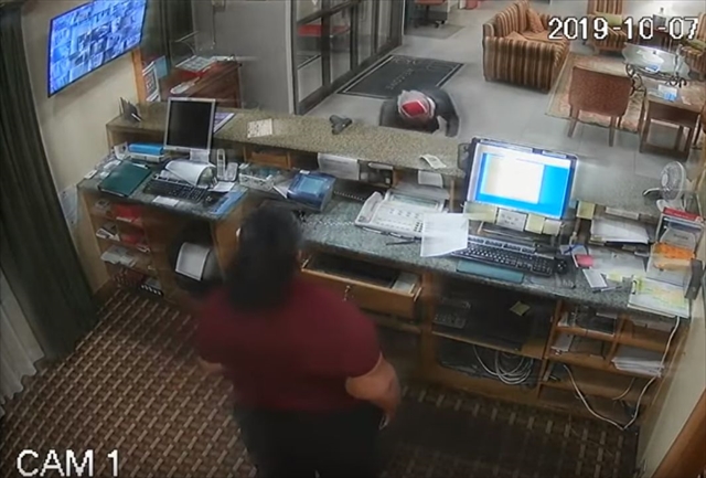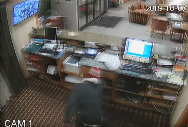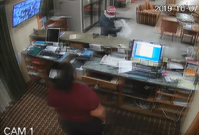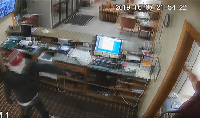 とあるホテルに強盗が侵入し、絶対絶命のピンチに!その一部始終をホテルに設置された監視カメラがとらえていました。