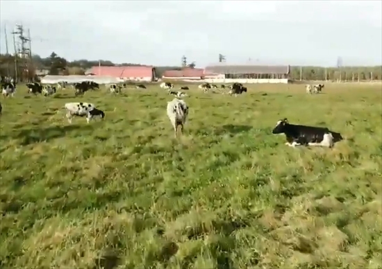 今回Twitterで話題となっているのは、広大な敷地を飛び回るドローンが、くつろいだり、寝ている牛を次々に起こしていく様子です。