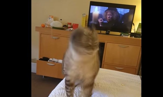 たしかにニャンコの後ろにあるテレビ画面には、ハリー・ポッターの映像がばっちり映っていますよね。