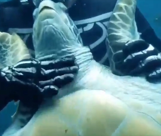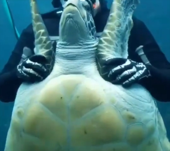 こちらがその動画です。ダイバーさんが水族館で飼育されているウミガメとたわむれています。