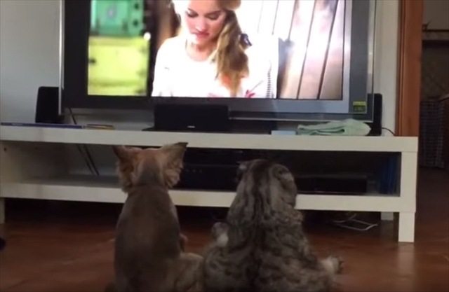 まるで人間の兄弟のよう・・テレビを並んで鑑賞するワンコとニャンコが可愛らしい!