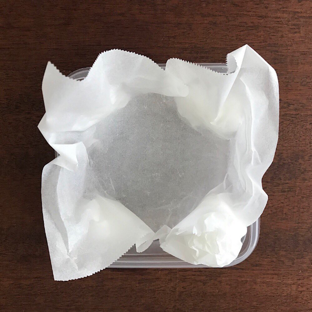 家庭によくあるジップロックコンテナ容器を使用、しかもオーブン用シートを丸めて角に詰めておくことで丸く形成できるなんて思いつきませんでした!普段あまりお菓子作りをしない方など、ケーキの型がないというケースもありますもんね。優しいレシピだ・・・(感動)。