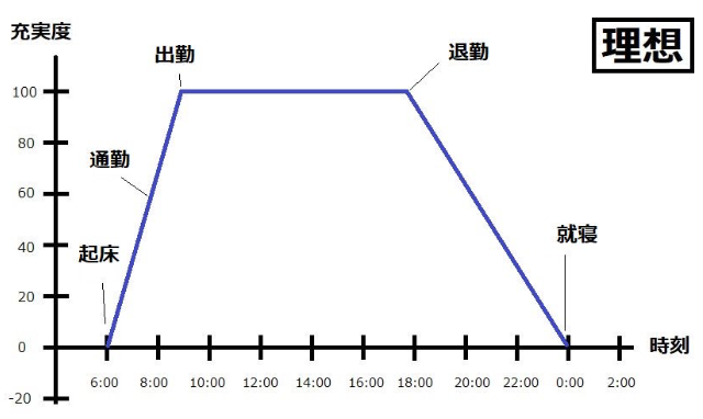 起床から出勤に向けて充実度が段々と高まり勤務中は一定を継続、そして退勤とともに徐々に低下。このように充実度に持続性があるのが理想的と考える人が多いですよね。