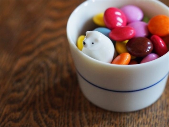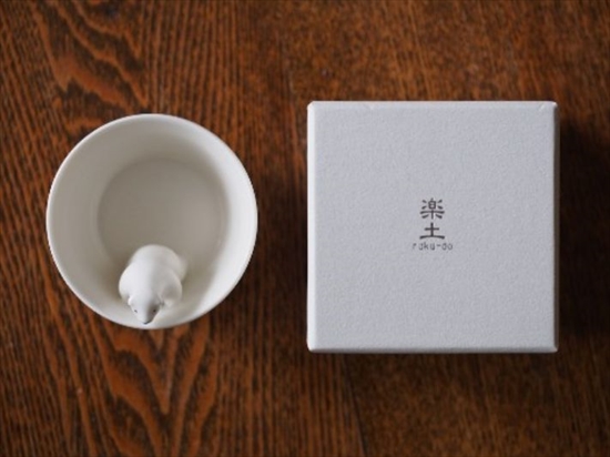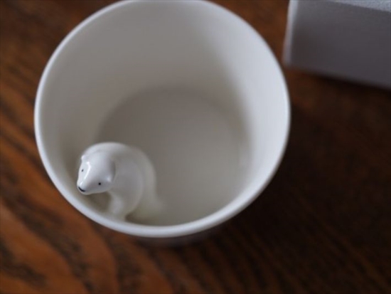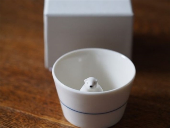 商品名は「シロクマの熊五郎 お猪口」。磁器製の酒器となり、小さくて可愛らしいシロクマが中にくっついて入っています。ちょこんと出している顔がなんとも・・(笑)