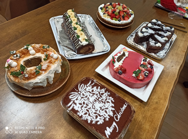 ティラミス、いちごのグラサージュムース(ココアスポンジを挟んでます)、ガトーショコラ、シフォンケーキりんごコンポートのせ、バナナのロールケーキ、フルーツタルト、です。 pic.twitter.com/nvWTXQll03— たこやき@不登校 (@ja_takoyaki) 2019年12月22日