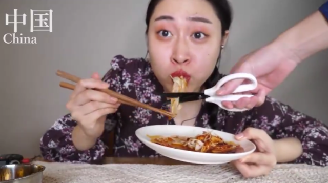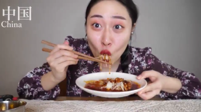 ファッションやメイクから中国人女子の雰囲気を再現する丸山さん。中国語(風?)の挨拶からの、勢いよく食事がスタートします。